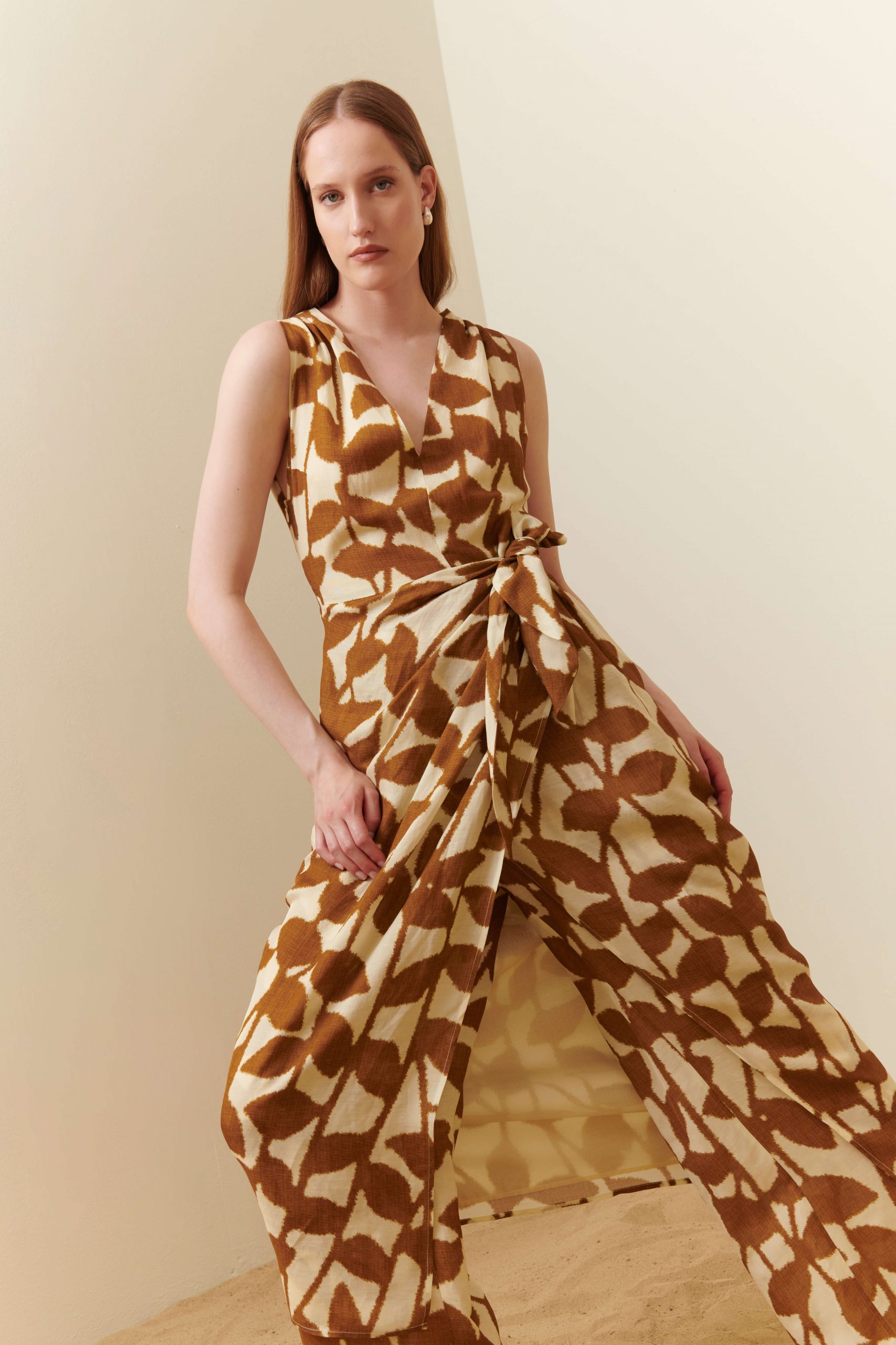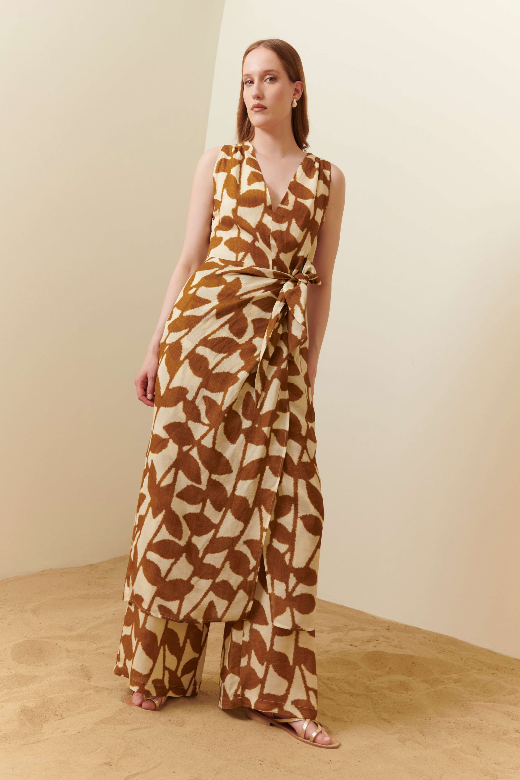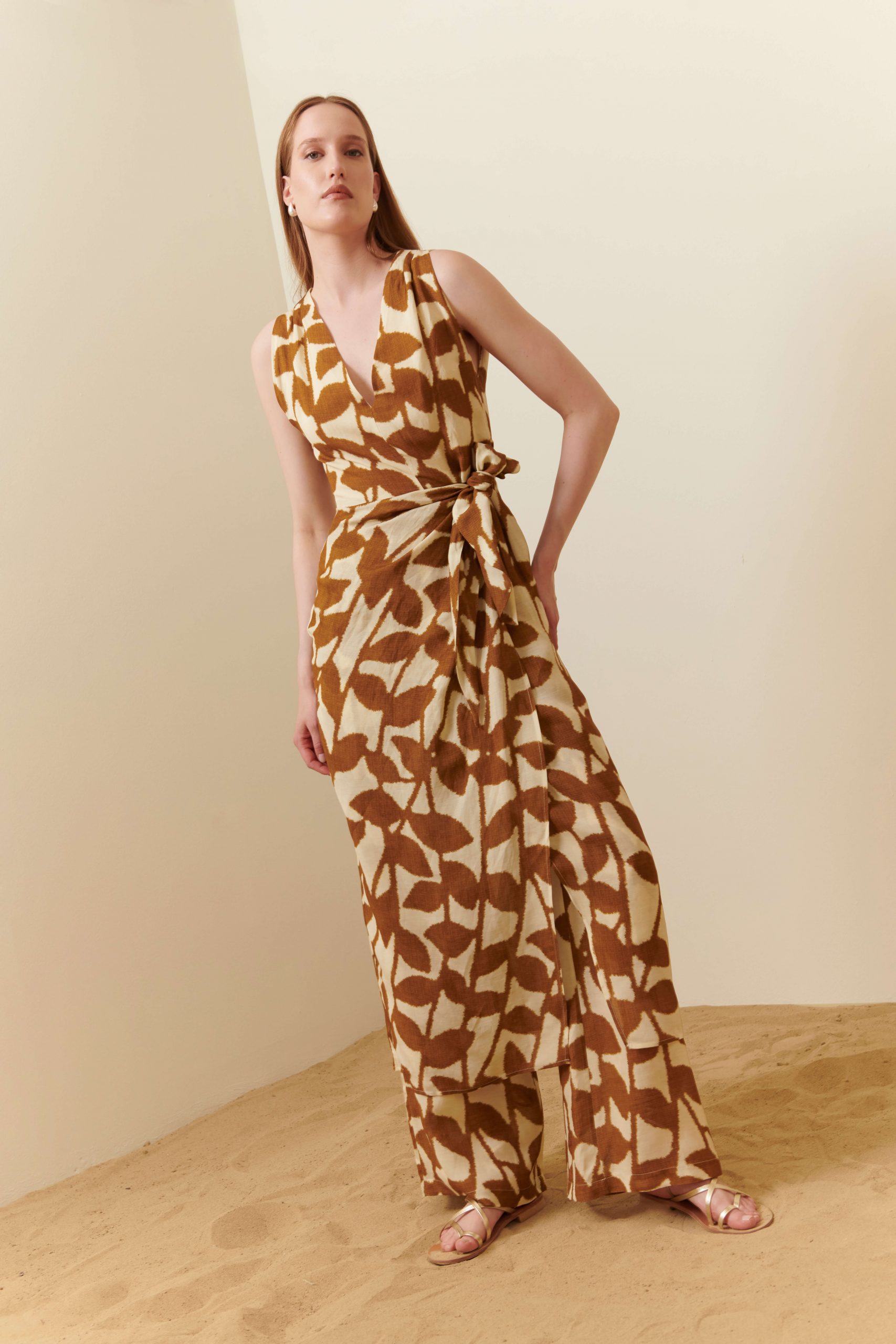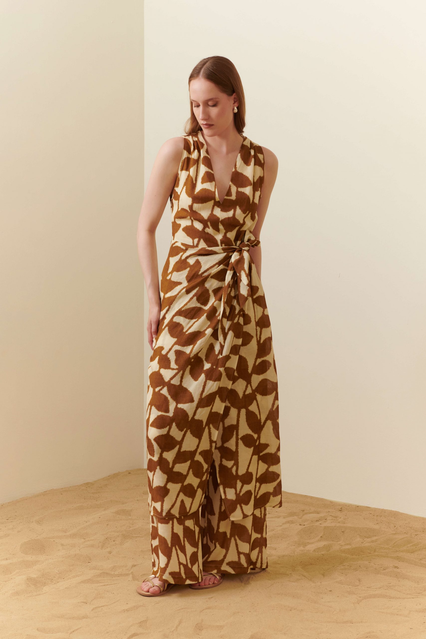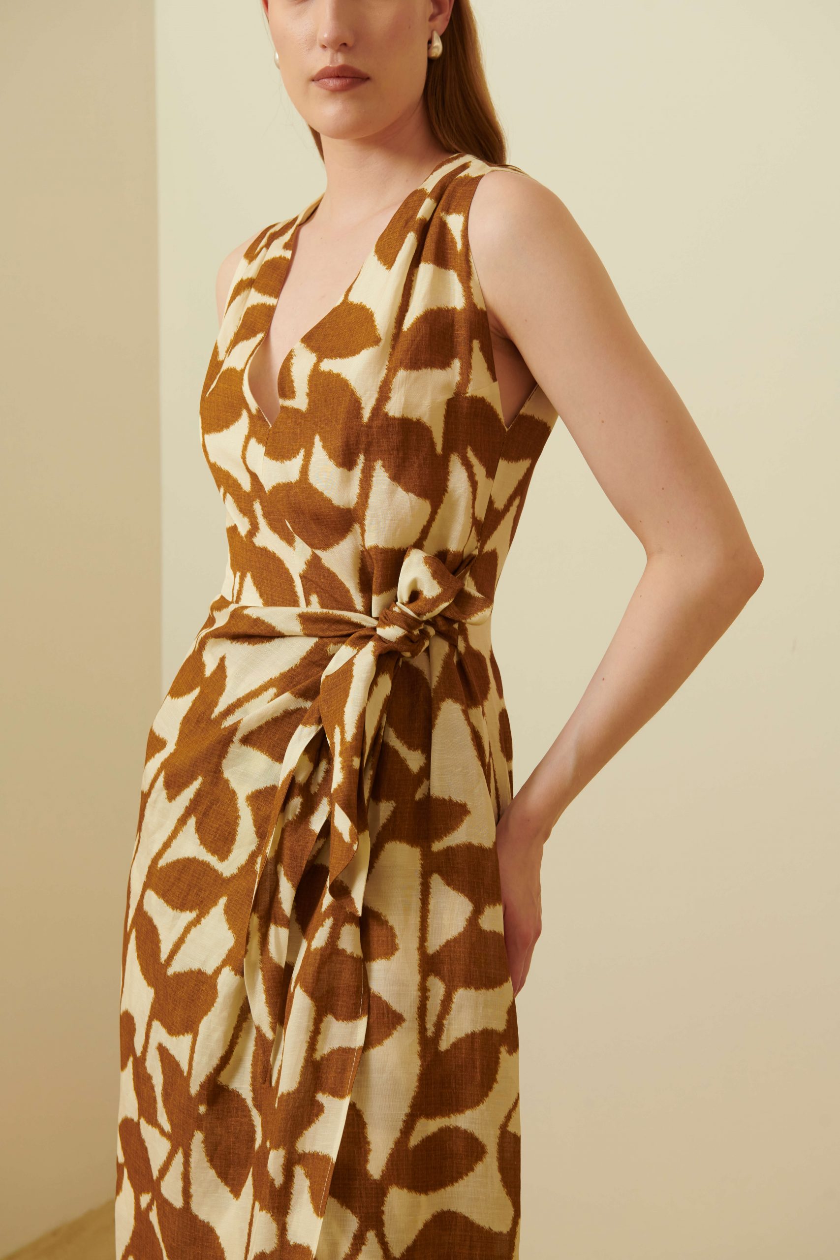 Abito a portafoglio in fantasia cinnamon foliage, viscosa & lino con nodo in vita e scollo a V